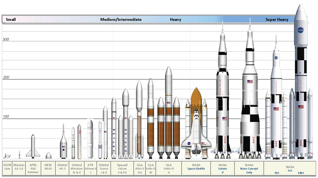 资料图:图为美国各型运载火箭(含空天飞机)类别与尺寸示意图。(拖拽图片或右键“在新标签页中打开”可查看大图)