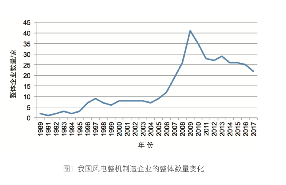 2010年以前,我国风电整机制 造企业数量整体呈上升之势。尤其是2006年之后,增速明显加快。2009年达到41家之多,是目前为止数量 最多的一年。随后,国内每年实现新 增装机的整机制造企业数量逐步下降,2017年仅剩下22家,较2009年减 少近一半。这一走势实际上与我国风 电产业发展的关键节点以及市场规律高度契合。2005年,我国《可再生能源法》获得审议通过,于2006年1月1日正式施行,为我国可再生能 源产业发展释放重大政策利好。此后, 国家相关部门又出台风电上网标杆电 价政策,并组织数轮特许权招标,由 此,我国风电产业进入快速的规模化 发展期,催生出对风电机组供应的庞大需求,大批整机制造企业涌现。然 而在2011年前后,受政策、市场环 境变化等因素的影响,产业发展出现 波动,一批前期不重视技术积累的企 业选择撤离或者倒闭。经过此轮洗牌, 市场趋于理性,从以价格为导向转变 为以性能为导向,新增装机份额逐步 向具有技术优势的企业聚集,市场集 中度显著提高。因此,2011-2017年, 我国每年实现新增装机的整机制造企 业数量整体呈下降之势。